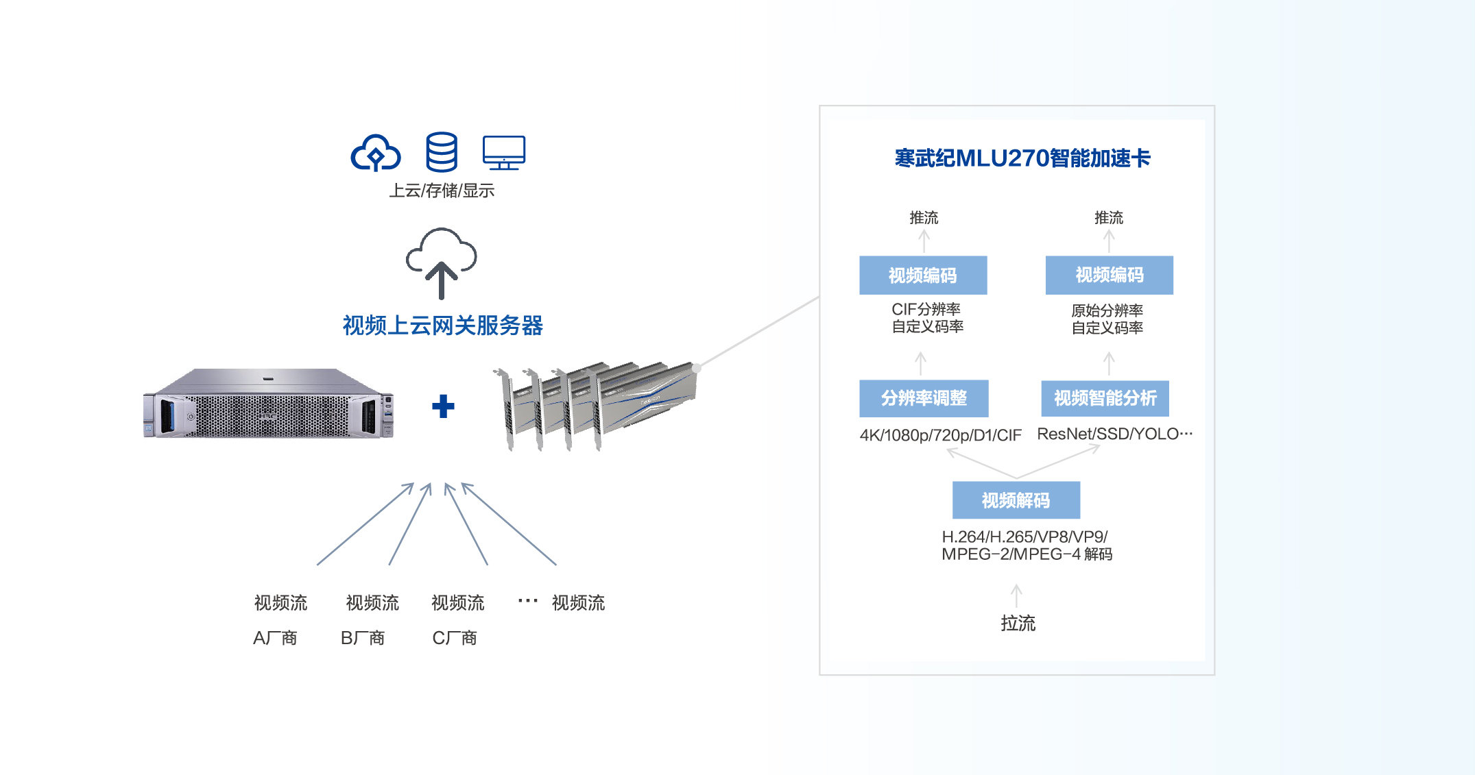 在云端,单卡MLU270可处理16路高清视频的时间检测,单台服务器可扩展至8卡;在边缘端,单卡MLU220可支持4路高清视频的事件检测,单台边缘端设备可扩展至16路的并发性能。