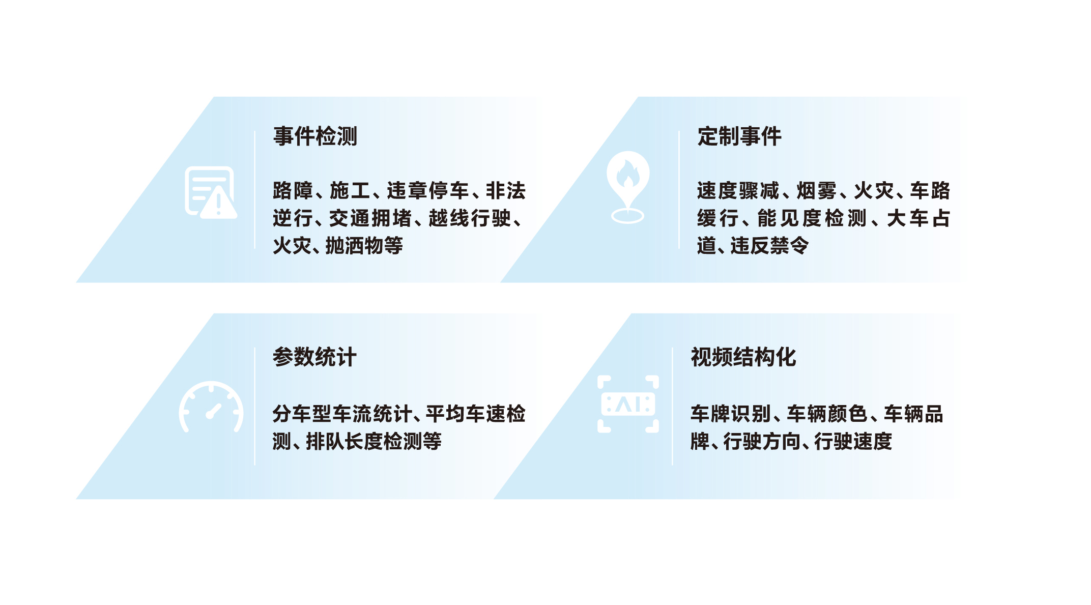 高速公路安全事故高发于桥梁、隧道、服务区出入口、恶劣天气等司机视野受限的区域与时间段,高速路安全运行方案可提供事件检测、定制事件检测、参数统计等,为安全运行提供技术保障。