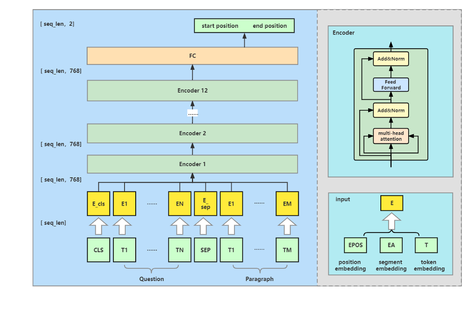 BERT可以有效改进许多自然语言处理任务,包括自然语言分类,文本匹配,命名实体识别和SQuAD 问答等任务。本文主要介绍基于 BERT_base 的 SQuAD 问答任务,以下是其训练框架结构: