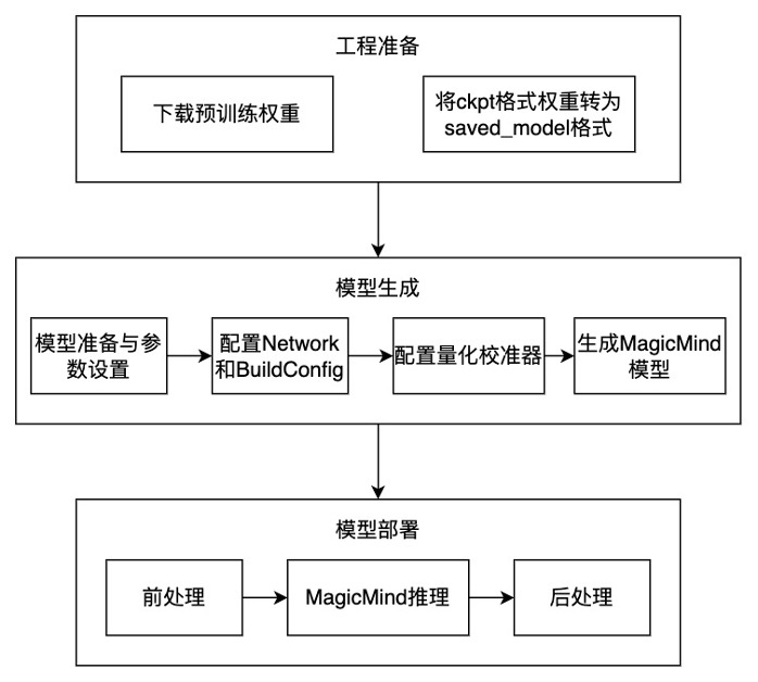 模型推理整体流程如下图所示,主要包含模型工程准备,模型生成和模型部署三部分: