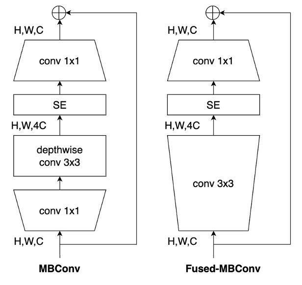V1中使用了MBConv结构,其中depthwise conv在专用加速器上的性能并不理想,作者提出了Fused-MBConv,使用conv3x3替换掉MBConv中的conv1x1和depthwise conv3x3,MBConv和Fused-MNBConv的结构如下图所示: