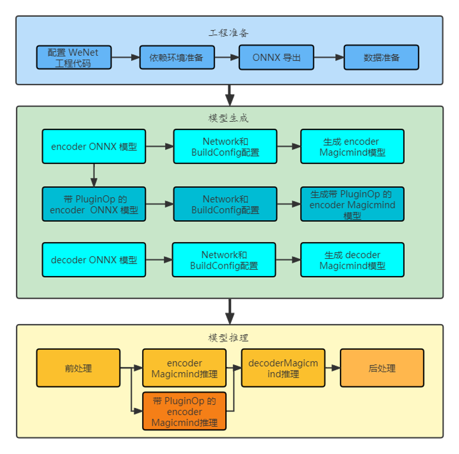 模型推理整体流程如下图所示,主要包含模型工程准备,模型生成和模型推理三部分本实验使用星空体育推理引擎 MagicMind 搭建了简单的推理应用,主要包括 Encoder 和 Decoder 两部分。