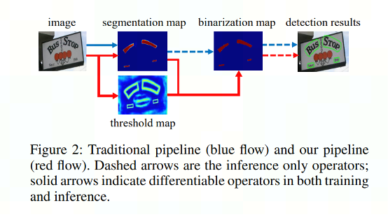 蓝色箭头描述的是基于分割的普通文本检测算法流程,该方法得到分割结果后采用一个固定的阈值得到二值化分割图,最后使用一些像素聚类操作得到文本区域。