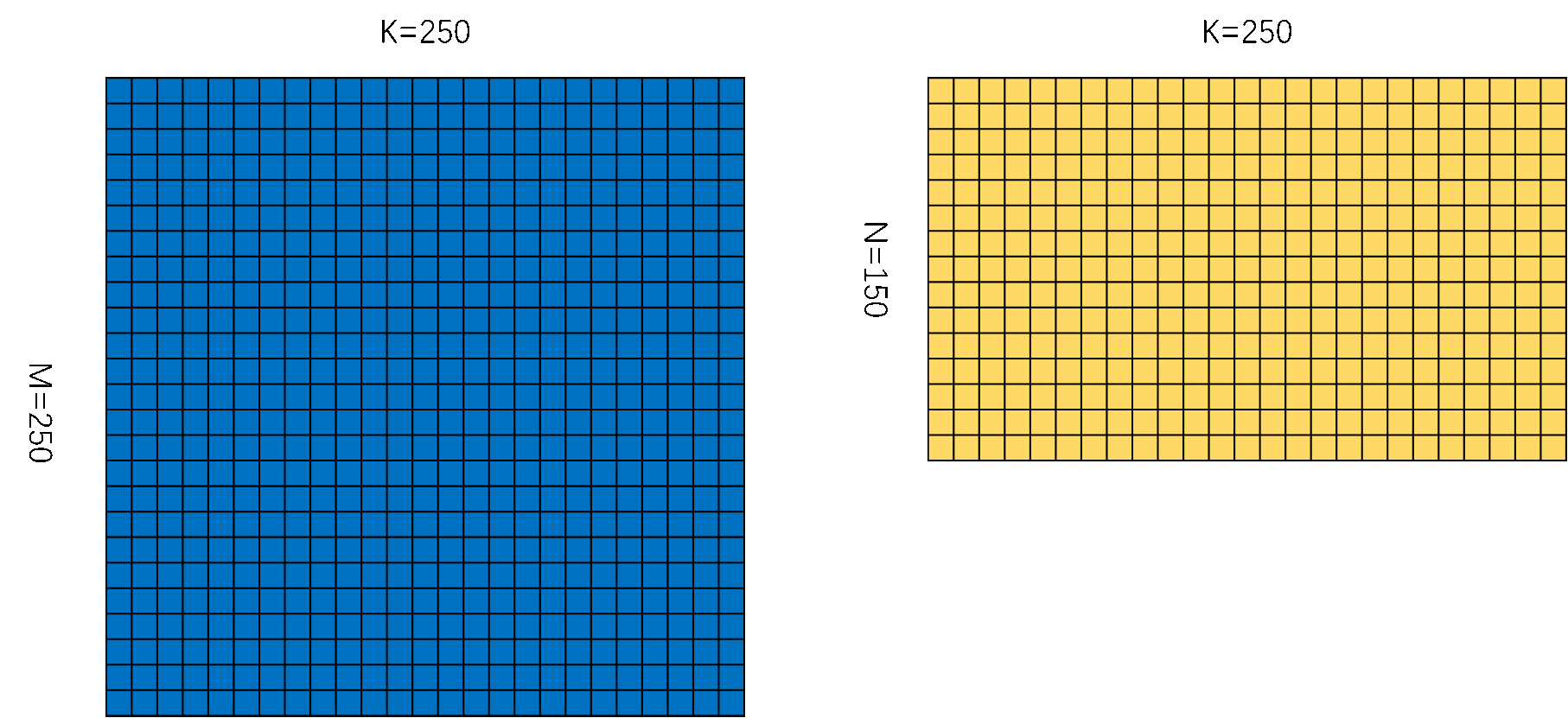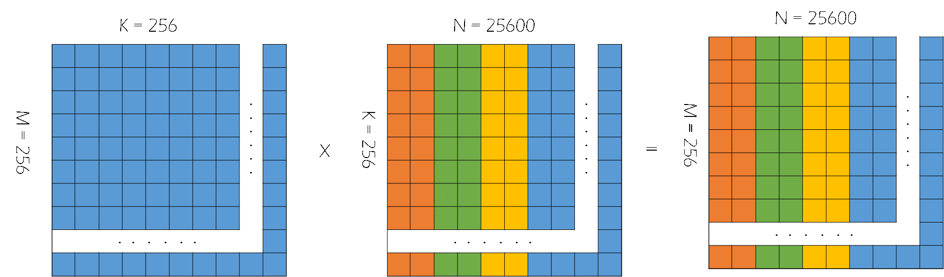我们先介绍下后续要解决的矩阵乘中的矩阵规模大小问题,为了方便展示和读者理解,假设的是左矩阵规模大小为256*256,右矩阵规模大小为256*N(N可被256整除)。
