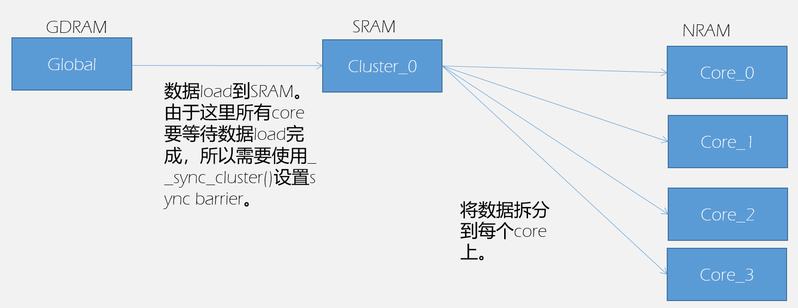 第二步是在第一步的基础上引入NRAM/WRAM的使用,每个core都有自己的NRAM和WRAM,虽然相比于GDRAM空间小,但是可以获得更高的读写带宽和更低的访问时延。(片上存储层次相关介绍可参考BANG C开发者手册)