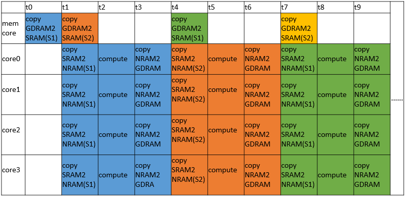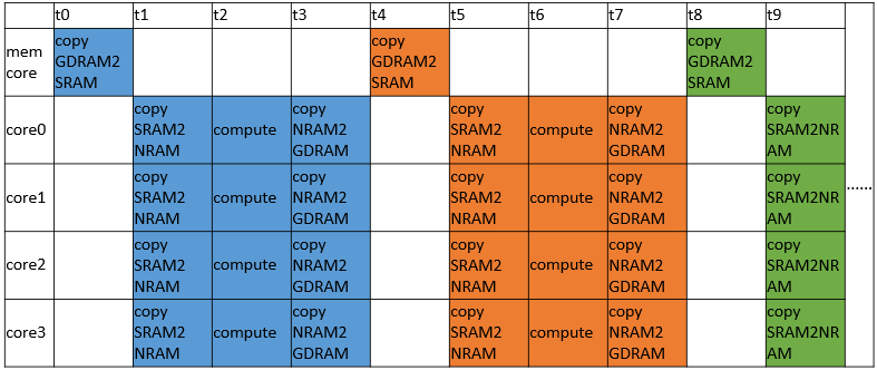 MLU270上,每个cluster除了4个普通的计算core之外,还有专门用以管理片上总线和SRAM的memory core。这就是上一步提到的两种不同功能的计算单元,为我们使用流水线优化创造了条件。