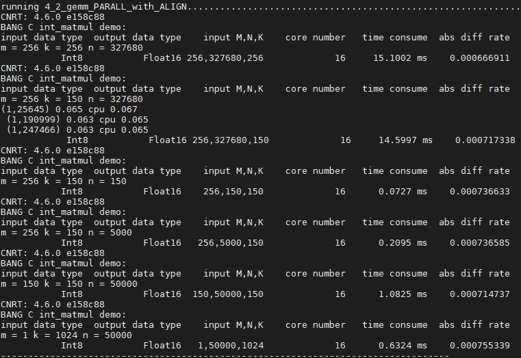 dim.x = 1;dim.y = 1;dim.z = 1;CNRT_CHECK(cnrtMalloc((void **)&d_c, sizeof(half) * M * N_align));CNRT_CHECK(cnrtMalloc((void **)&d_a, sizeof(half) * M * K));CNRT_CHECK(cnrtMalloc((void **)&d_w, sizeof(half) * K * N_align)); A_half = (half *)malloc(sizeof(half) * M * K);B_half = (half *)malloc(sizeof(half) * K * N_align);cnrtKernelInitParam_t init_param;CNRT_CHECK(cnrtCreateKernelInitParam(&init_param));CNRT_CHECK(cnrtInitKernelMemory((const void*)gemm16Kernel, init_param));cnrtKernelParamsBuffer_t params;CNRT_CHECK(cnrtGetKernelParamsBuffer(¶ms)); CNRT_CHECK(cnrtKernelParamsBufferAddParam(params, &d_c, sizeof(half *))); CNRT_CHECK(cnrtKernelParamsBufferAddParam(params, &d_a, sizeof(half *)));CNRT_CHECK(cnrtKernelParamsBufferAddParam(params, &d_w, sizeof(half *)));CNRT_CHECK(cnrtKernelParamsBufferAddParam(params, &M, sizeof(uint32_t)));CNRT_CHECK(cnrtKernelParamsBufferAddParam(params, &K, sizeof(uint32_t)));CNRT_CHECK(cnrtKernelParamsBufferAddParam(params, &N_align, sizeof(uint32_t)));cnrtNotifier_t notifier_start; // A pointer which points to the struct describing notifier.cnrtNotifier_t notifier_end;CNRT_CHECK(cnrtCreateNotifier(¬ifier_start));CNRT_CHECK(cnrtCreateNotifier(¬ifier_end));float timeTotal = 0.0;//printf("start invoke : \n");gettimeofday(&start, NULL);CNRT_CHECK(cnrtPlaceNotifier(notifier_start, pQueue)); // Places a notifier in specified queueCNRT_CHECK(cnrtInvokeKernel_V3((void *)&gemm16Kernel,init_param, dim, params, func_type, pQueue, NULL)); // Invokes a kernel written in Bang with given params on MLUCNRT_CHECK(cnrtPlaceNotifier(notifier_end, pQueue)); // Places a notifier in specified queue
