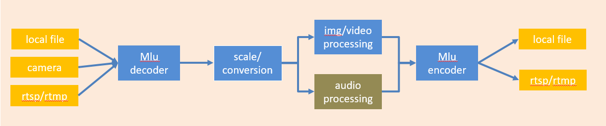 基于FFMpeg-MLU的转码方案主要是将CNCodec SDK集成到原生开源的FFMpeg中,基于原生FFMpeg丰富的生态及便捷的使用接口,但是底层基于MLU硬件实现。这里主要介绍FFMpeg-MLU转码方案。